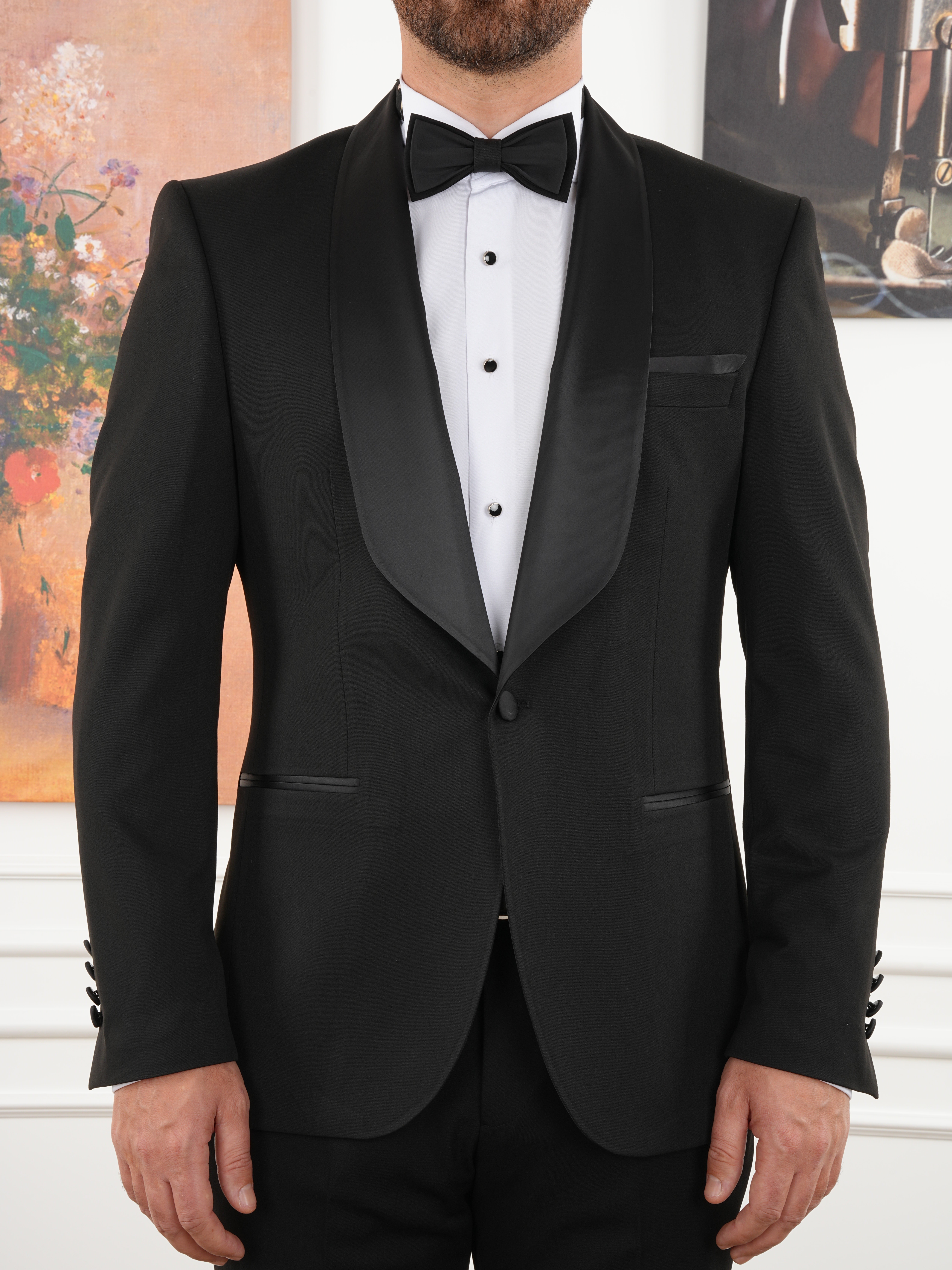 Abito da sposo smoking da uomo stile italiano giacca con collo sciallato pantaloni papillonNero (Xprzcom8911-001)