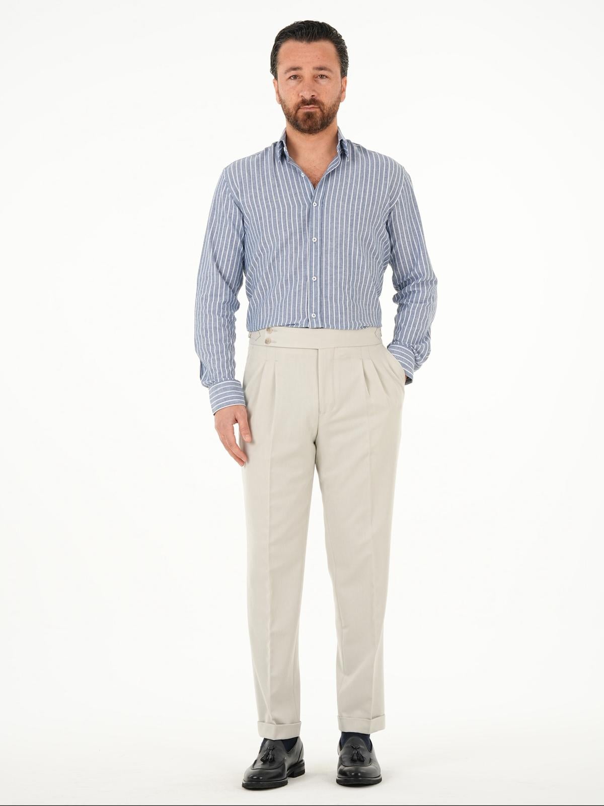 Premium Erkek Regular Fit Çizgili Keten Gömlek - Lacivert (XPRZG2028-02)