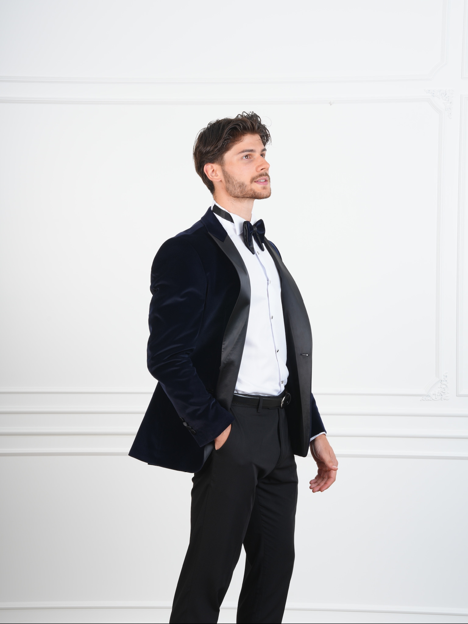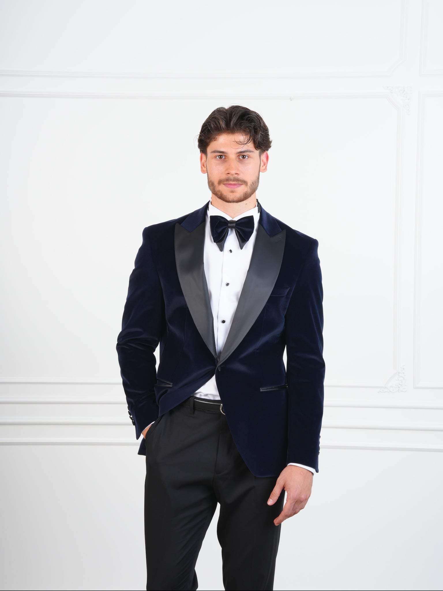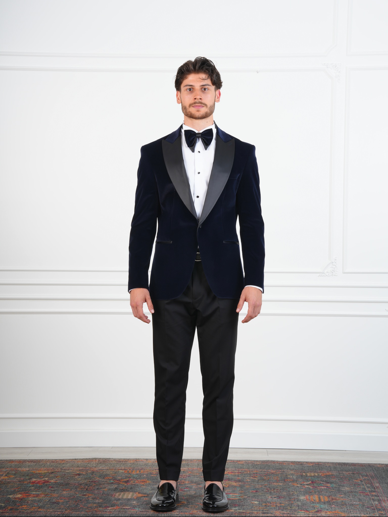 Erkek Premium Kadife Smokin Damatlık İtalyan Stil Slim Fit Ceket Pantolon Papyon - Lacivert (XPRZCOM2435-02)